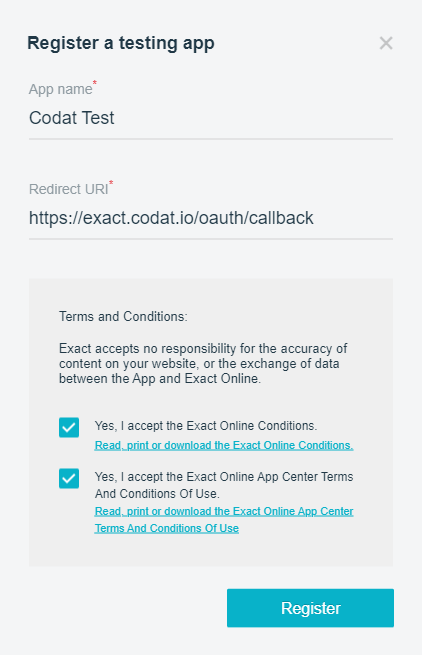 • The Redirect URL must be as follows, for both production and testing apps: https://exact.codat.io/oauth/callback