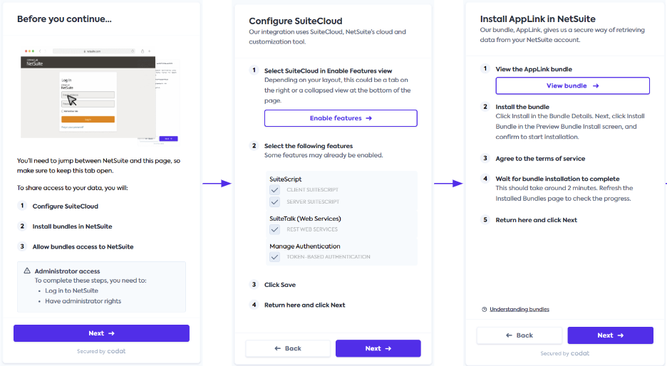 We have revised and improved the user interface of the connectionConnection A link between a Codat company and a data source (like an accounting platform). Each connection represents authorized access to pull or push data from that platform. flows for NetSuite, Sage Intacct, and QuickBooks Desktop. The updated connectionConnection A link between a Codat company and a data source (like an accounting platform). Each connection represents authorized access to pull or push data from that platform. flows are already available to all our clients that have these integrations enabled.